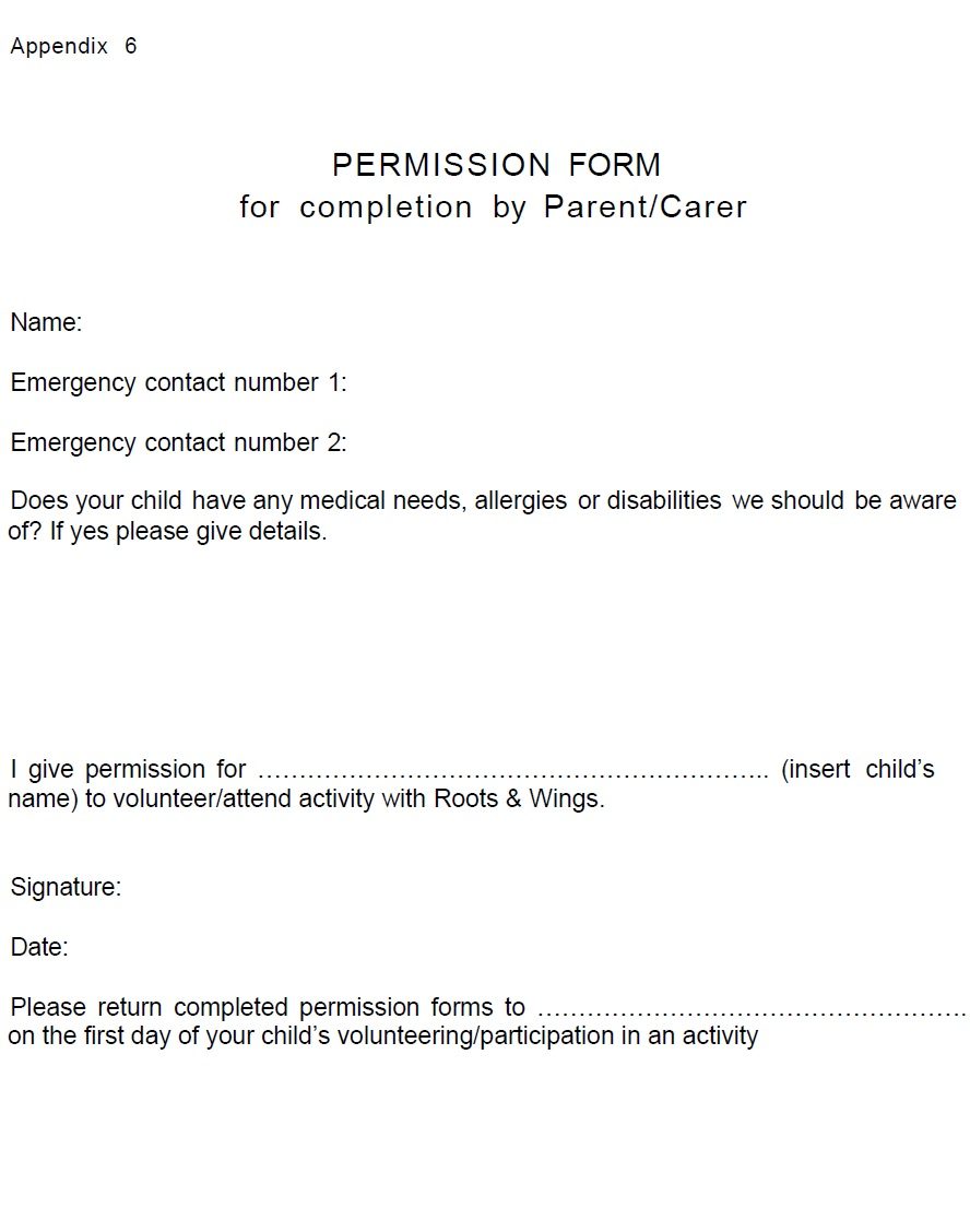 13.3 Any child or young person attending our organised projects must complete a permission form signed by a parent or guardian (see Appendix 6).